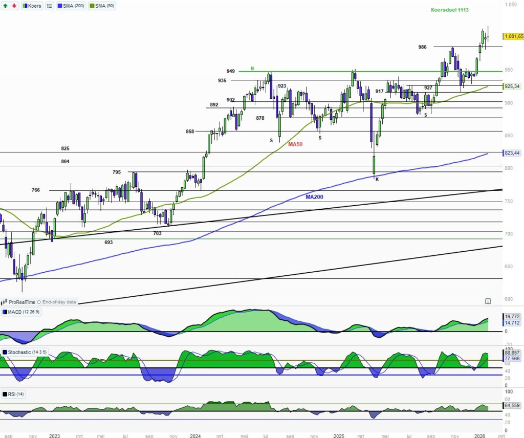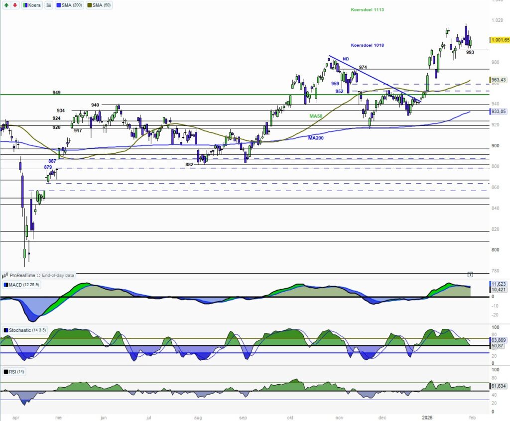 We zien een daggrafiek die pauzeert rond de 1000. Steun is er op 993. Indicatoren vrij goed.