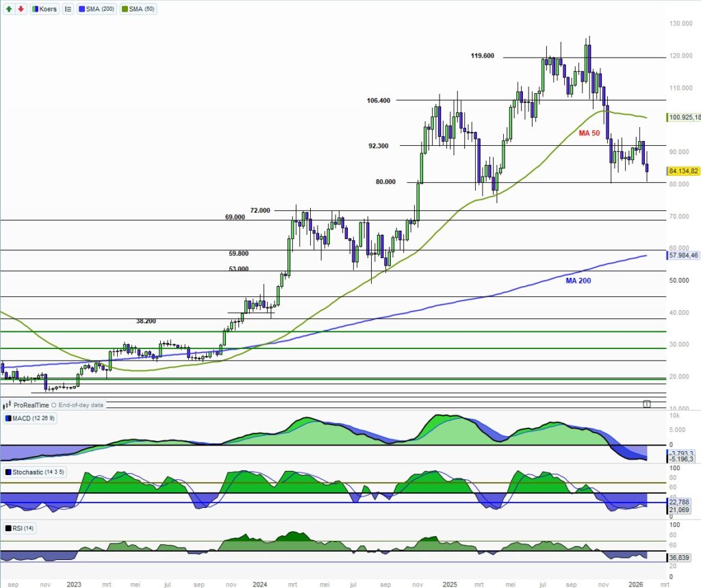 Bitcoin blijft zwak. Bij de recente opleving waarschuwde ik dat de indicatoren duidelijk nog negatief waren en de MA50 dalend. De steun 80.000 houdt tot nu toe maar de indicatoren staan slecht.