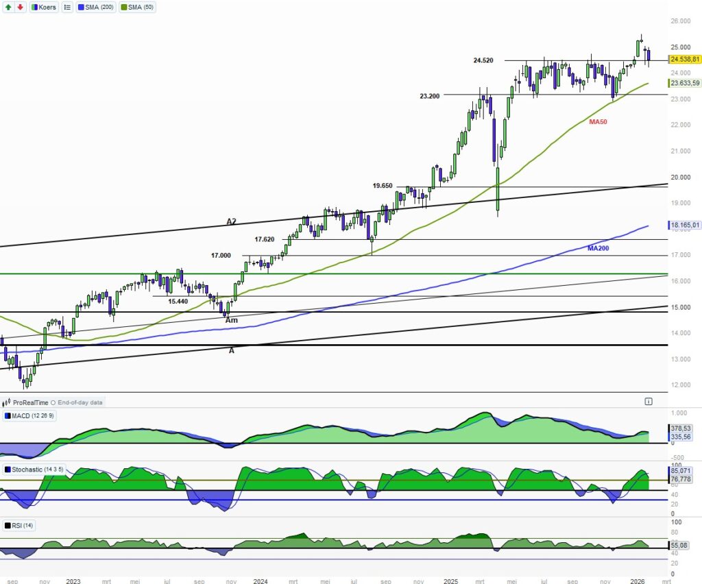 Na de uitbraak uit de zijwaartse zone doet de DAX een terugtest naar de 24.520. Dat is geheel volgens het boekje. De indicatoren draaien wat naar beneden.