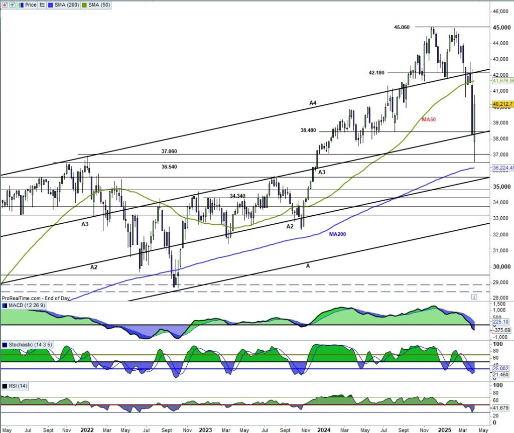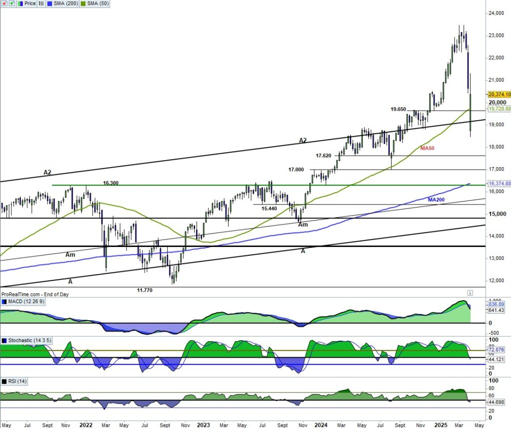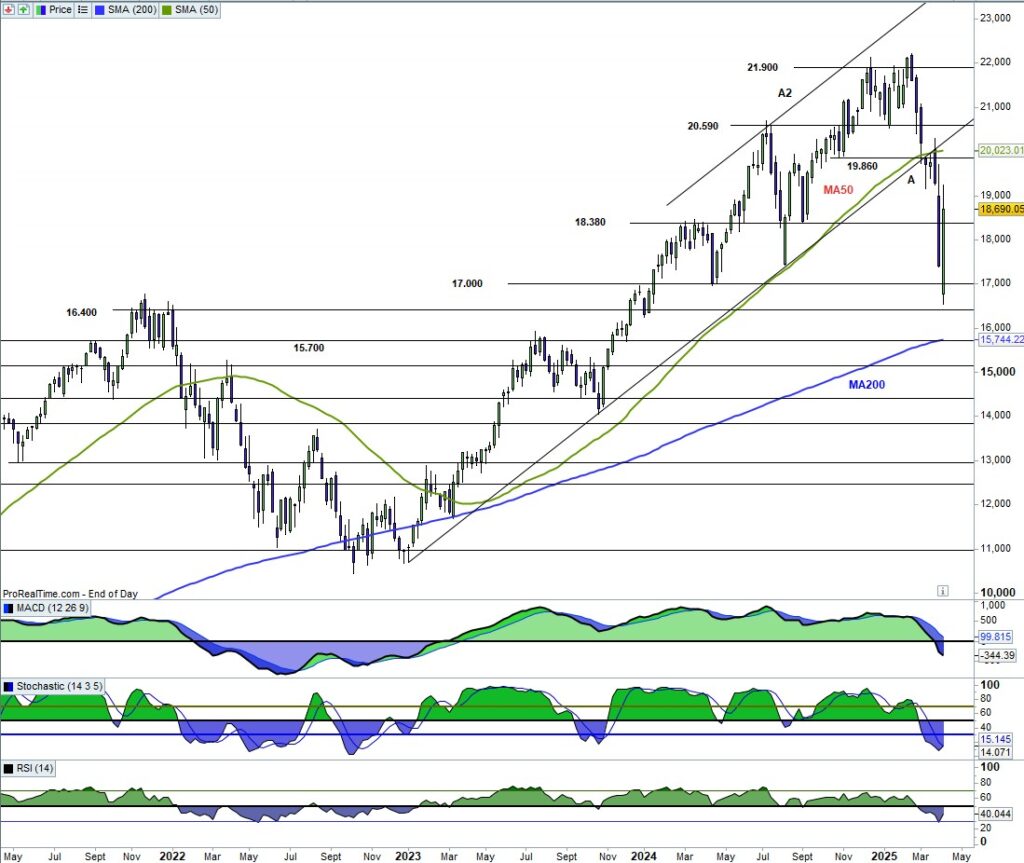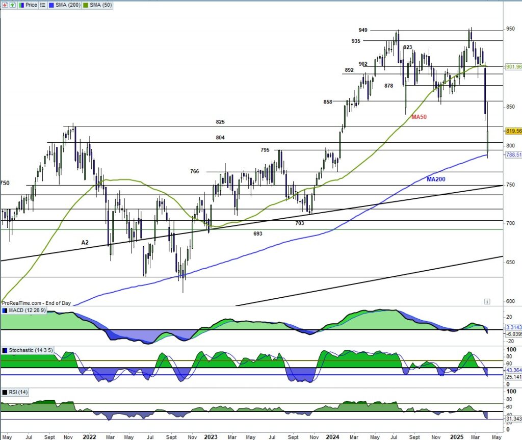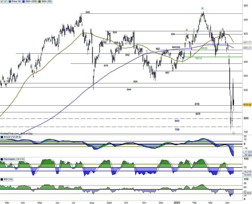 Er is in de daggrafiek een herstel geweest van 784 naar 856 toen Trump met uitstel kwam. Maar een duidelijke bodem lijkt het me niet en de indicatoren zijn absoluut slecht.