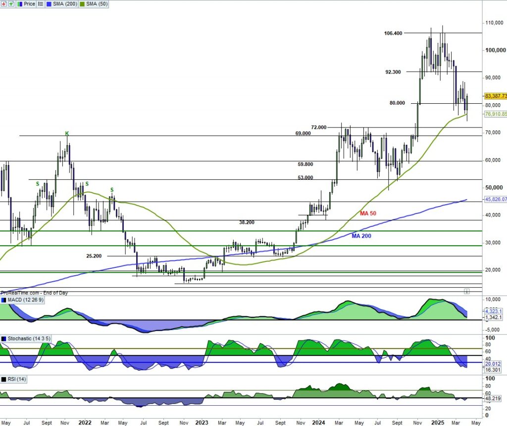 Zoals verwacht sloot Bitcoin boven de steun op 80.000. Maar we zijn er deze week al flink onder geweest en het wordt dus steeds moeilijker. 72.000 lijkt een beter niveau.