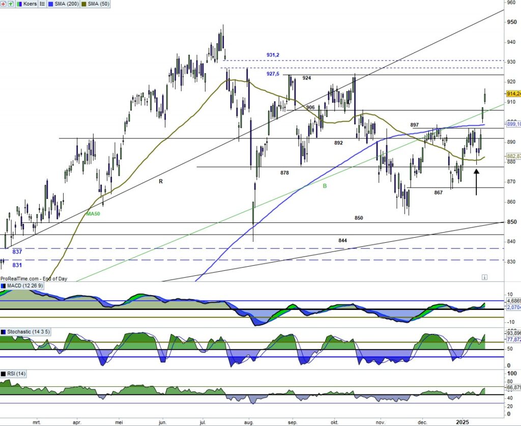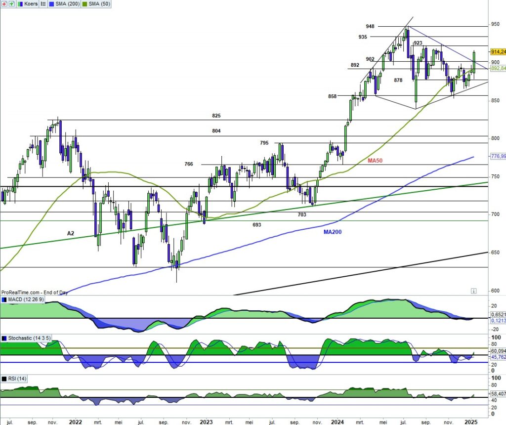 Ik zat er al wat op te wachten, de uitbraak naar boven uit de diamant. De candle van deze week is overtuigend. De candle geeft aan dat de steun op 878 stevig is. Door de weerstand 892 en 902. Nu op weg naar weerstand 923. De indicatoren blijven echter voorzichtig met een erg vlakke MACD.