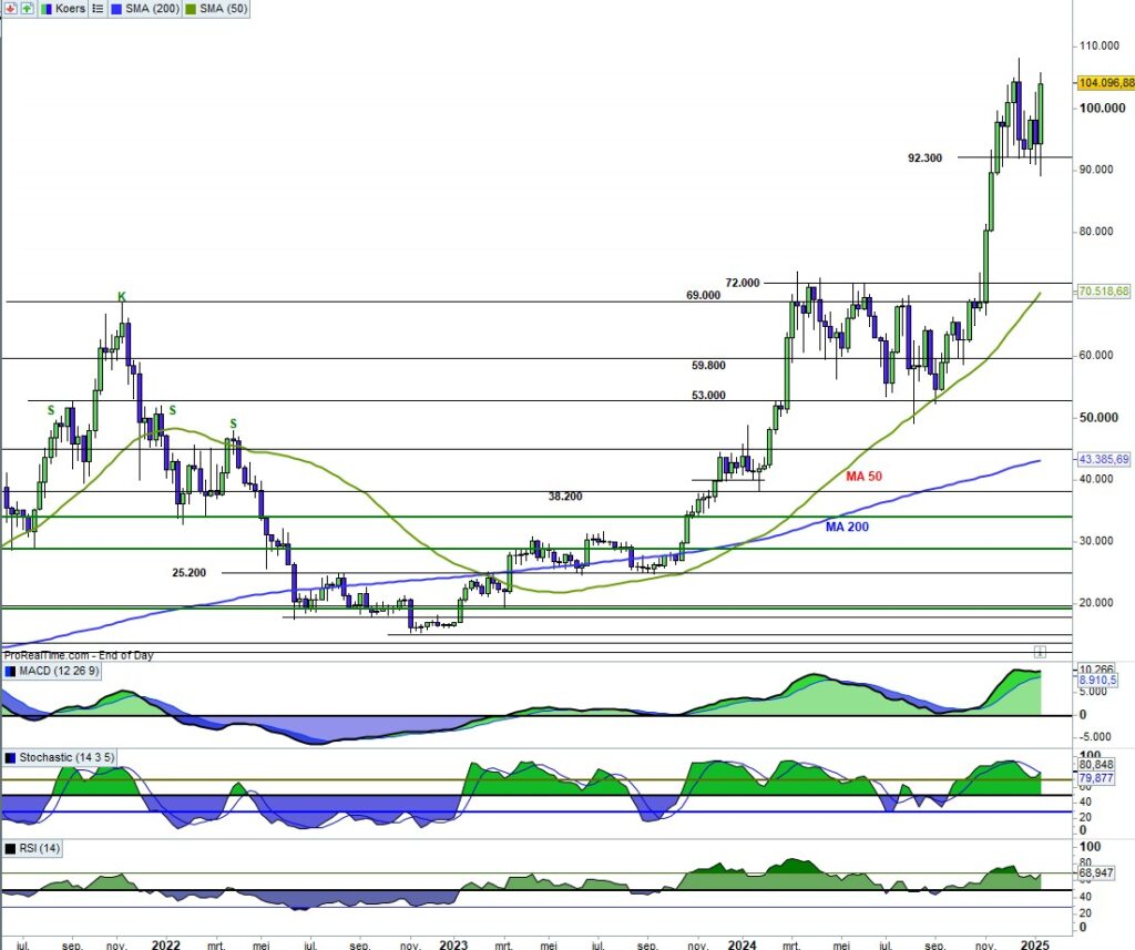 De verwachting was: “Vergelijkbaar met de Nasdaq. Ook hier de schaduw vooral boven de candle. Maar zeer sterke indicatoren, goede kans dat 92.300 het houdt.