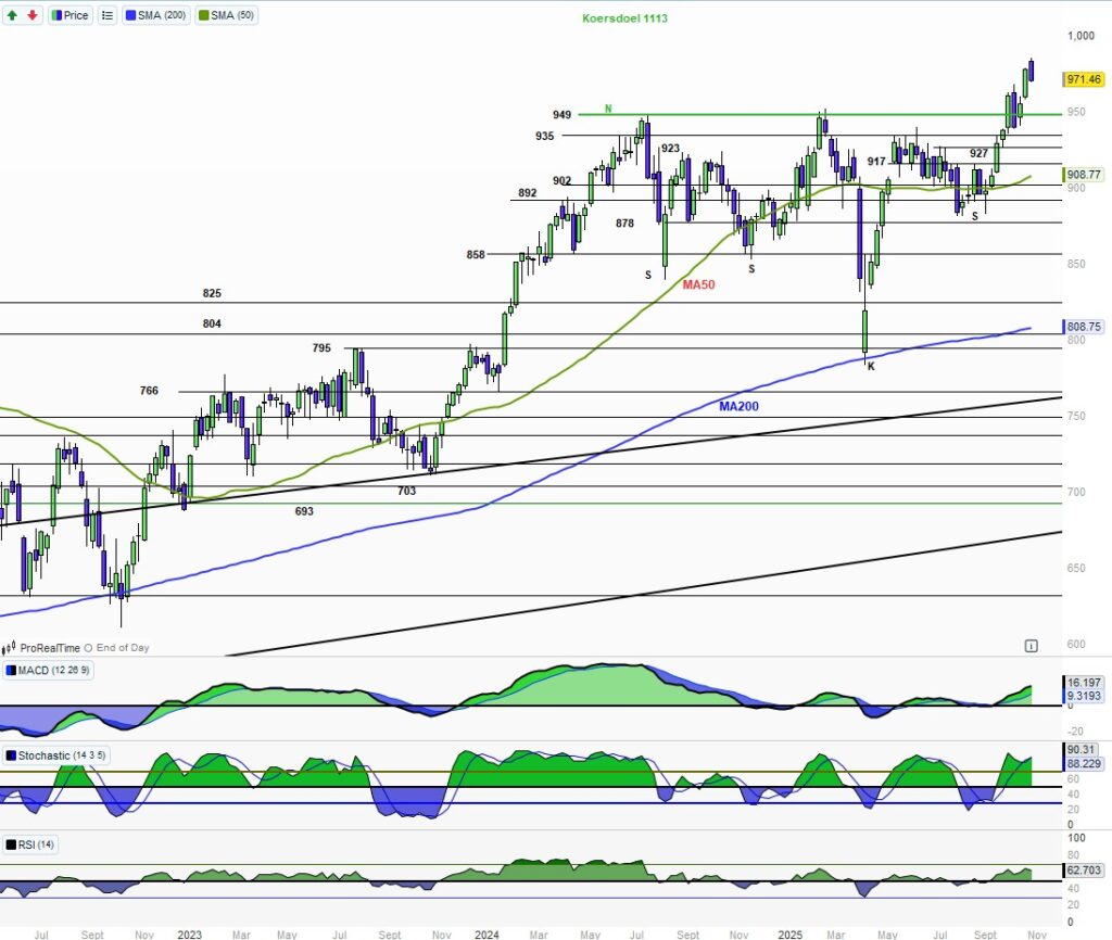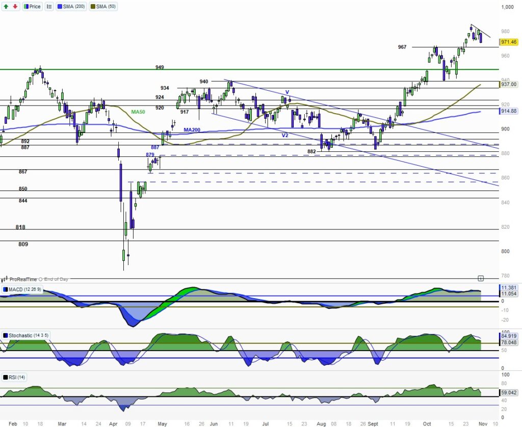 De daggrafiek lijkt op weg naar 967 en kan daar steun vinden.
