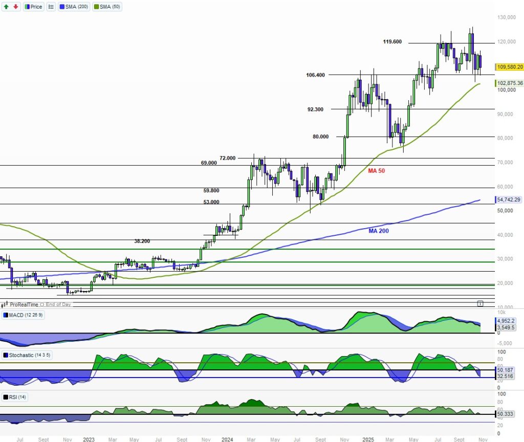 Vorige week schreef ik: “Bij Bitcoin hield de steun op 106.400 het. De indicatoren wijzen echter nog naar beneden. Dus nog in de correctiestand na een sterke fase.