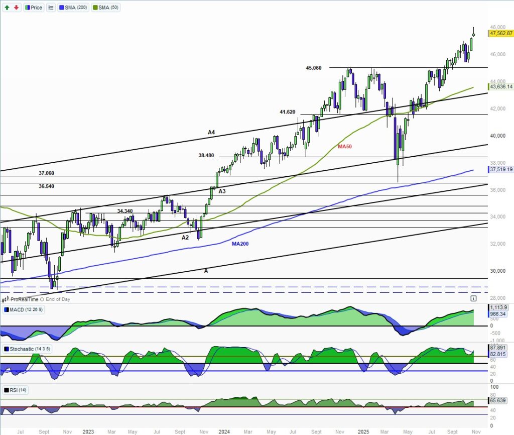 De Nasdaq is wederom gelijk aan de DOW. Maar een verschil is wel dat de Nasdaq nu bij zijn trendlijn A2 is aangekomen. Hier is dus een behoorlijke weerstand, maar de indicatoren wijzen omhoog.