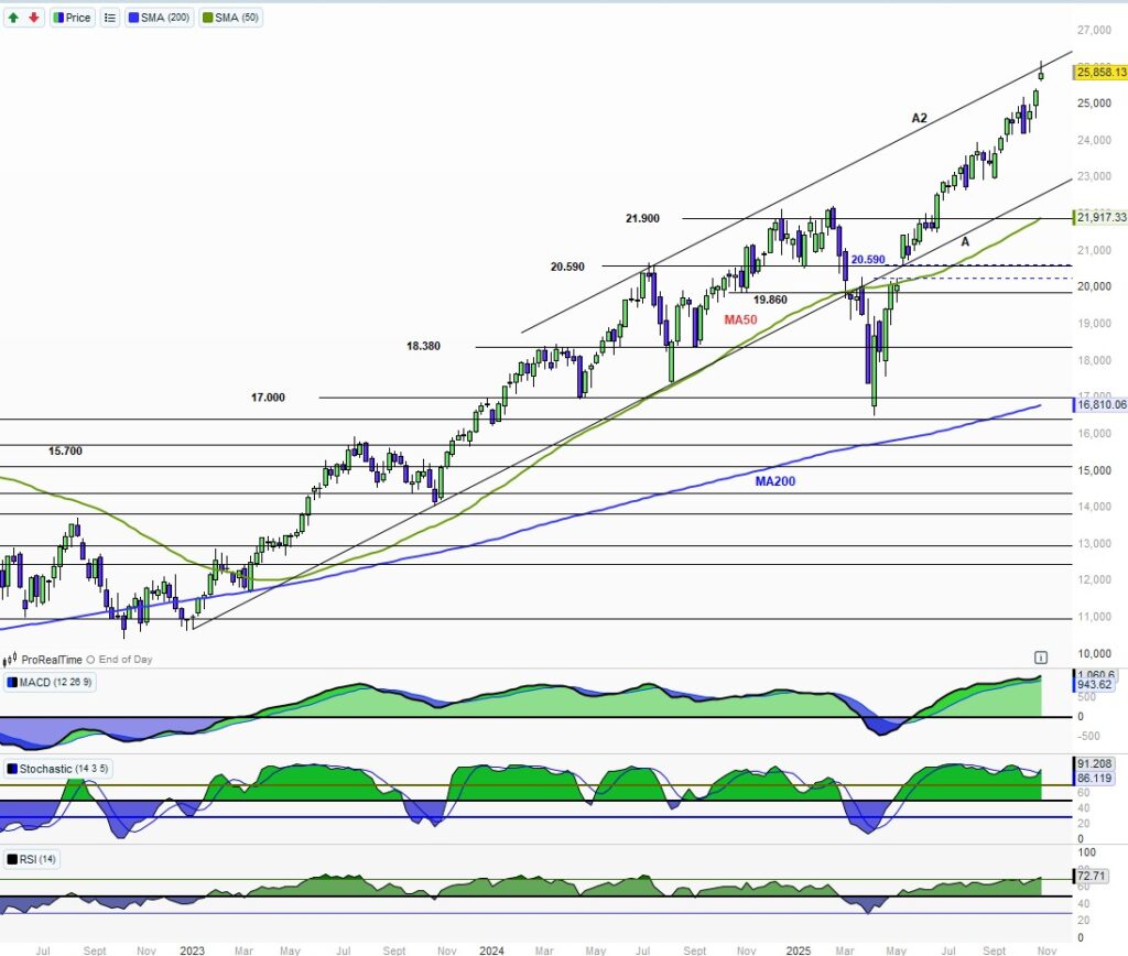 De DOW zette de alltime-high nog wat hoger maar kon dat niveau duidelijk niet volhouden. De candle kan het begin van een top zijn, dat wordt onderhand tijd ook.