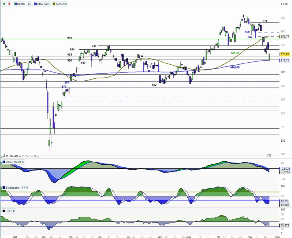 De candle van vorige week vrijdag met de lange schaduw onderin gaf de verwachting dat de neklijn het wel zou houden. Nou nee dus, liefst 35 punten eraf deze week. Dat is veel, het ging er wild aan toe. De onderste gaplijn op 952 was de weerstand, we kwamen er niet meer boven. Aan de onderkant was er deze week steun van de MA200 en de 917 en 920.