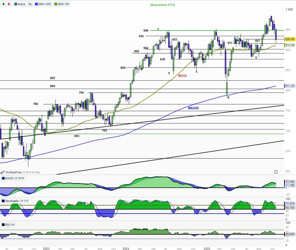 Door de koersontwikkeling op vrijdag veert de weekcandle op van 917 naar 927. Dat geeft wat hoop. Maar het blijft een negatieve candle die in principe op een vervolg naar beneden kan duiden. De neklijn van het omgekeerde kopschouderpatroon is overtuigend gebroken. Het koersdoel 1113 is ongeldig geworden. Maar ik heb het tussen haakjes gezet want mijn ervaring is dat het patroon zich vaak toch nog doet gelden. De indicatoren bewegen naar beneden maar ze staan niet in de negatieve zone.