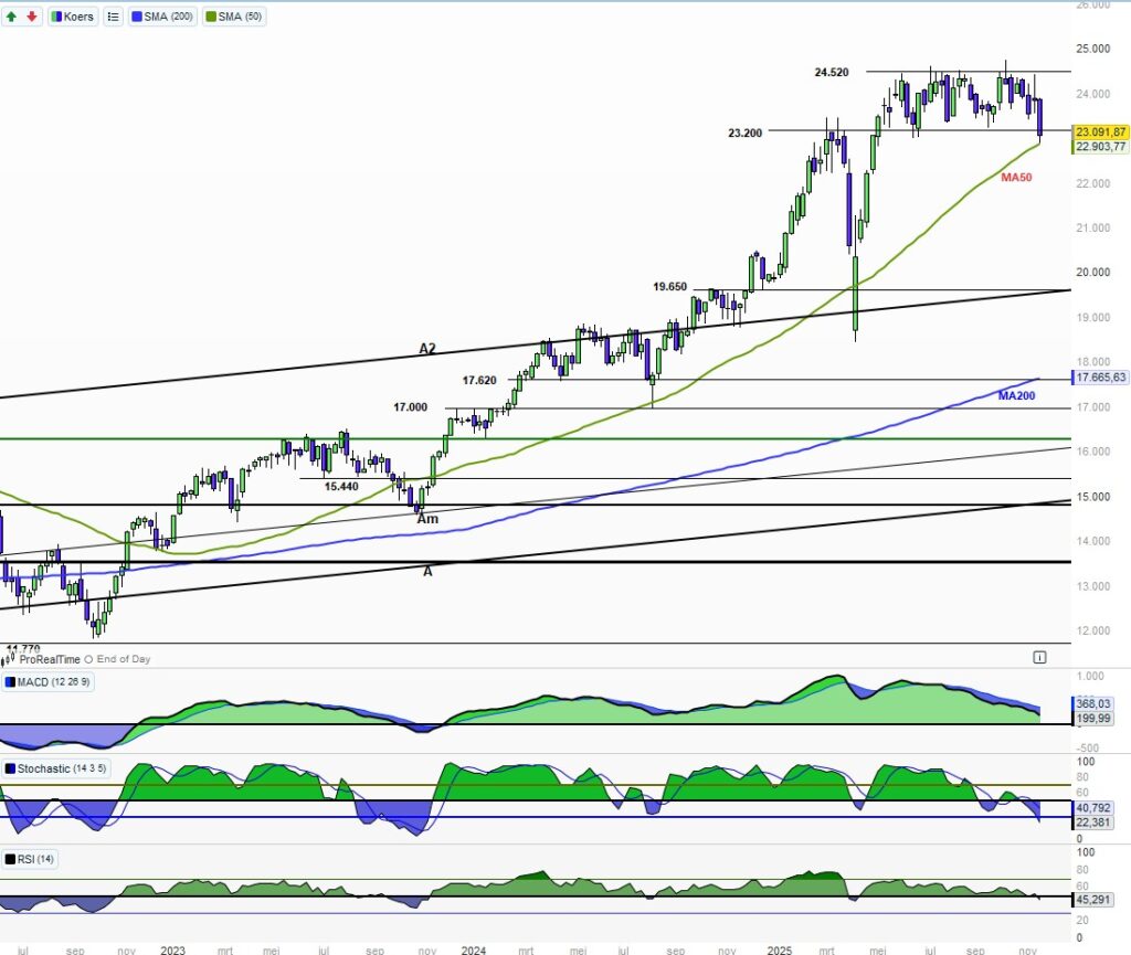 De DAX lijkt de zijwaartse zone aan de onderkant te gaan verlaten. Dat zou niet de eerste verwachting zijn bij een zijwaartse beweging na een opgaande beweging, maar het kan natuurlijk wel.