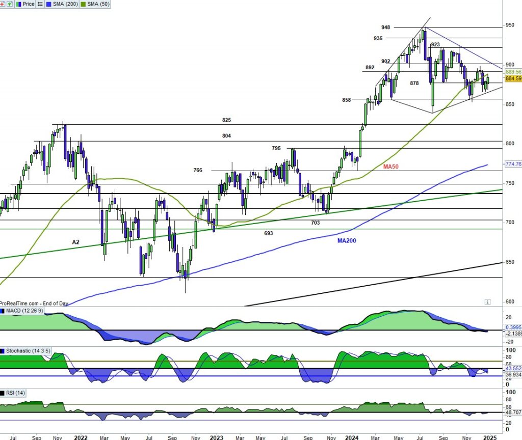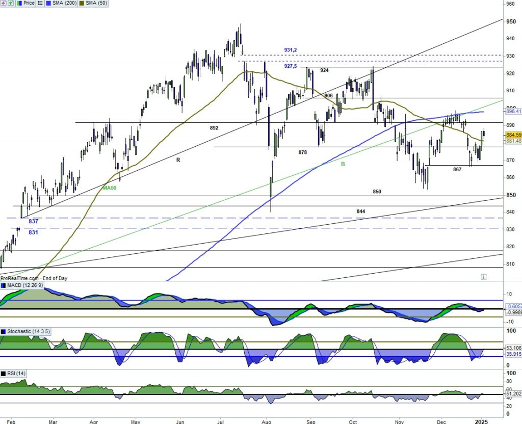Negen punten hoger sinds de vorige week. Een vrij kalme start van het nieuwe jaar, zeker als je naar de candle van vrijdag kijkt. Het goede nieuws is dat er een nieuwe, hogere bodem is gezet op 867. Bij vlakke maar stijgende indicatoren een voorzichtig positieve grafiek.