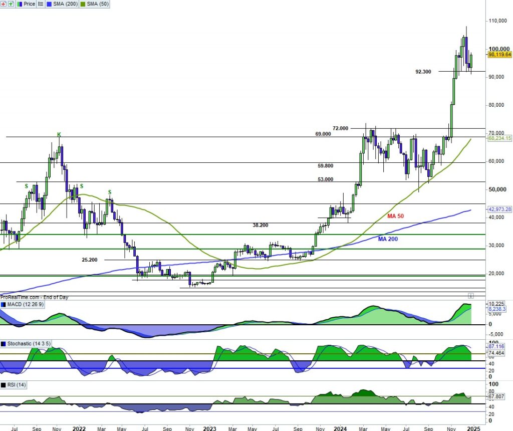 Bitcoin heeft een bodem gevormd op 92.300. De candle van deze week is goed en indicatoren staan sterk. Bitcoin kan weer verder omhoog.