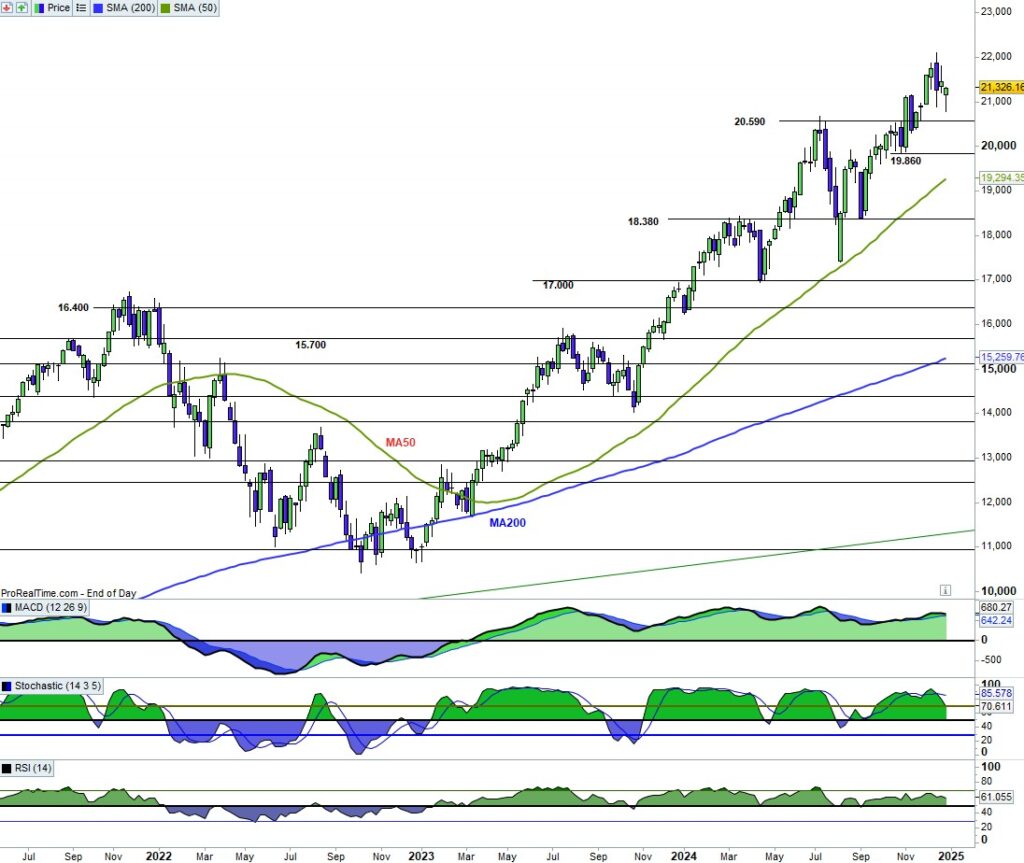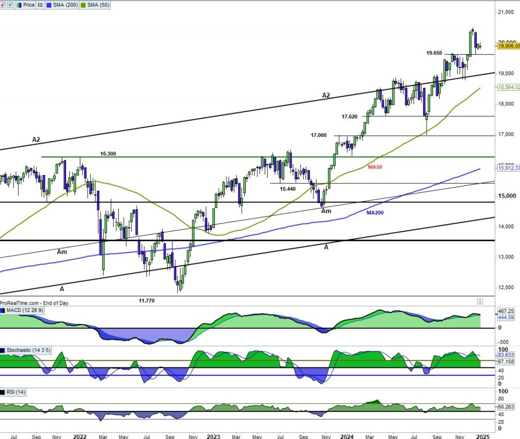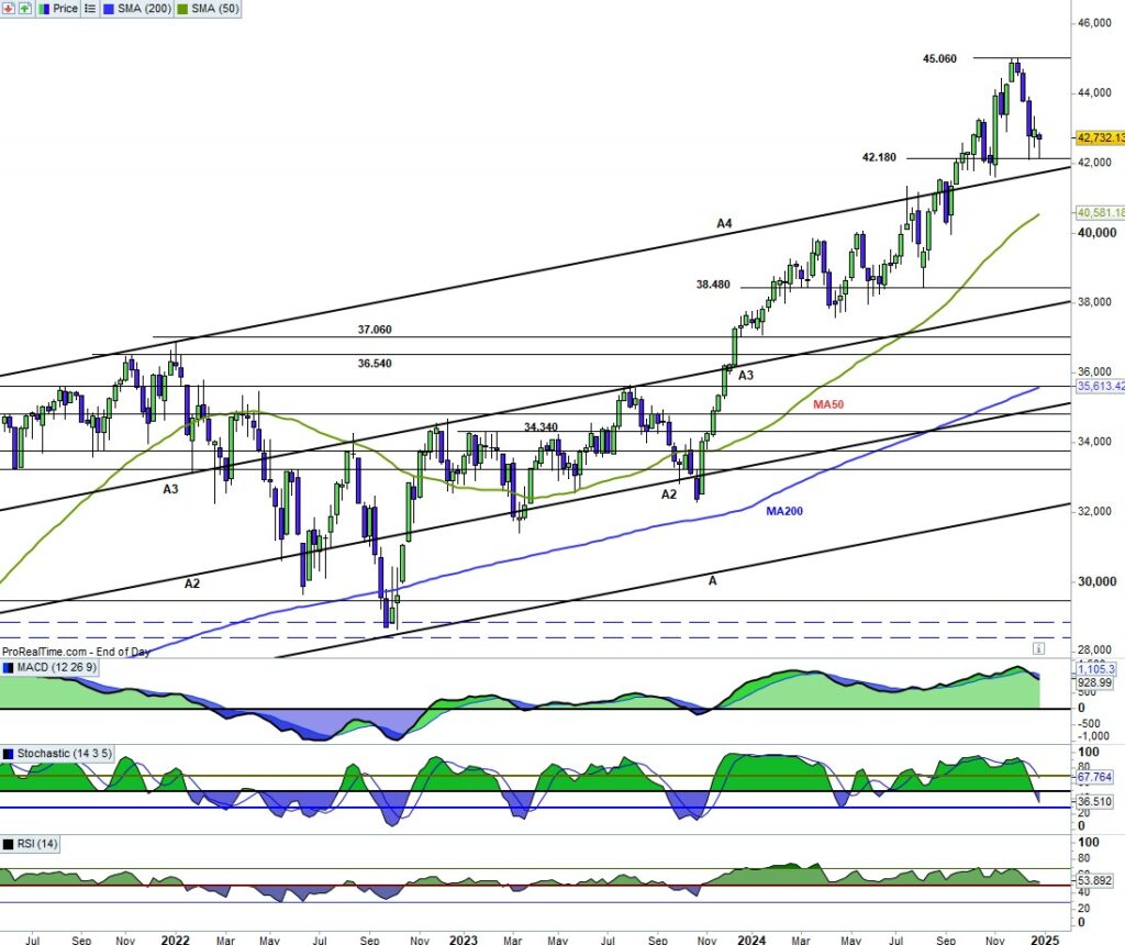 De candle van deze week wilde niet doordalen en er is nu steun op 42.180. De indicatoren corrigeren maar zijn wel op een gezond niveau. Kan wat verder corrigeren richting 42.180 of lijn A op 42.000.