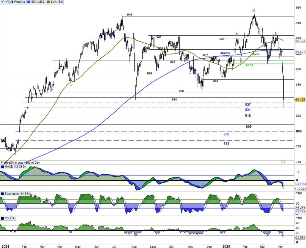 De MACD valt nog mee, de rest wijst hard naar beneden. In elk geval op weg naar de steun op 825.