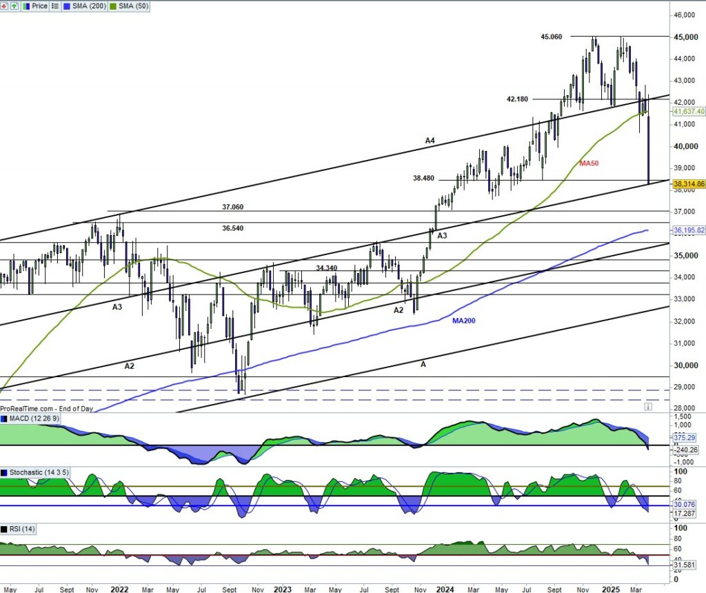 Hop. Zoals verwacht door de MA50 en ook nog door de steun op 38.480. Werkelijk precies steun gevonden op trendlijn A3. Maar slechte indicatoren, A3 krijgt het heel moeilijk.