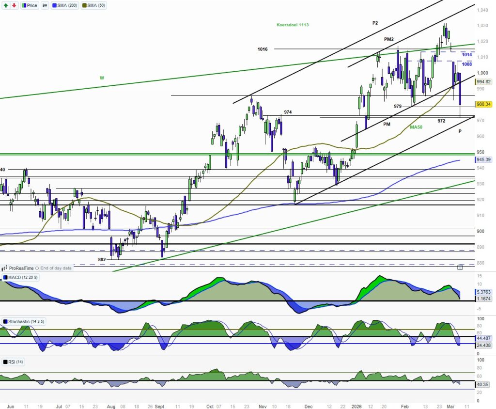 De AEX verlaat het middenkanaal PM-PM2 en zet een nieuw steuntje neer op 972. 972 – dat is toch een eind van de top op 1032. Indicatoren slecht, AEX lijkt op weg naar trendlijn P.
