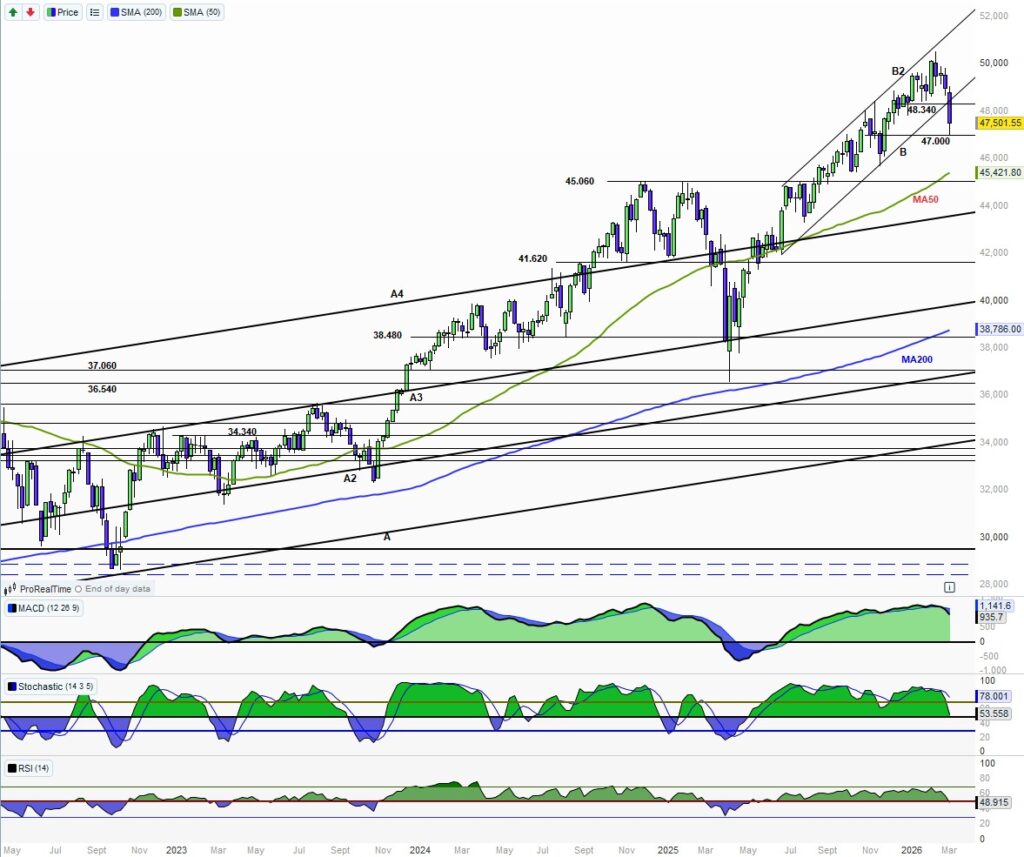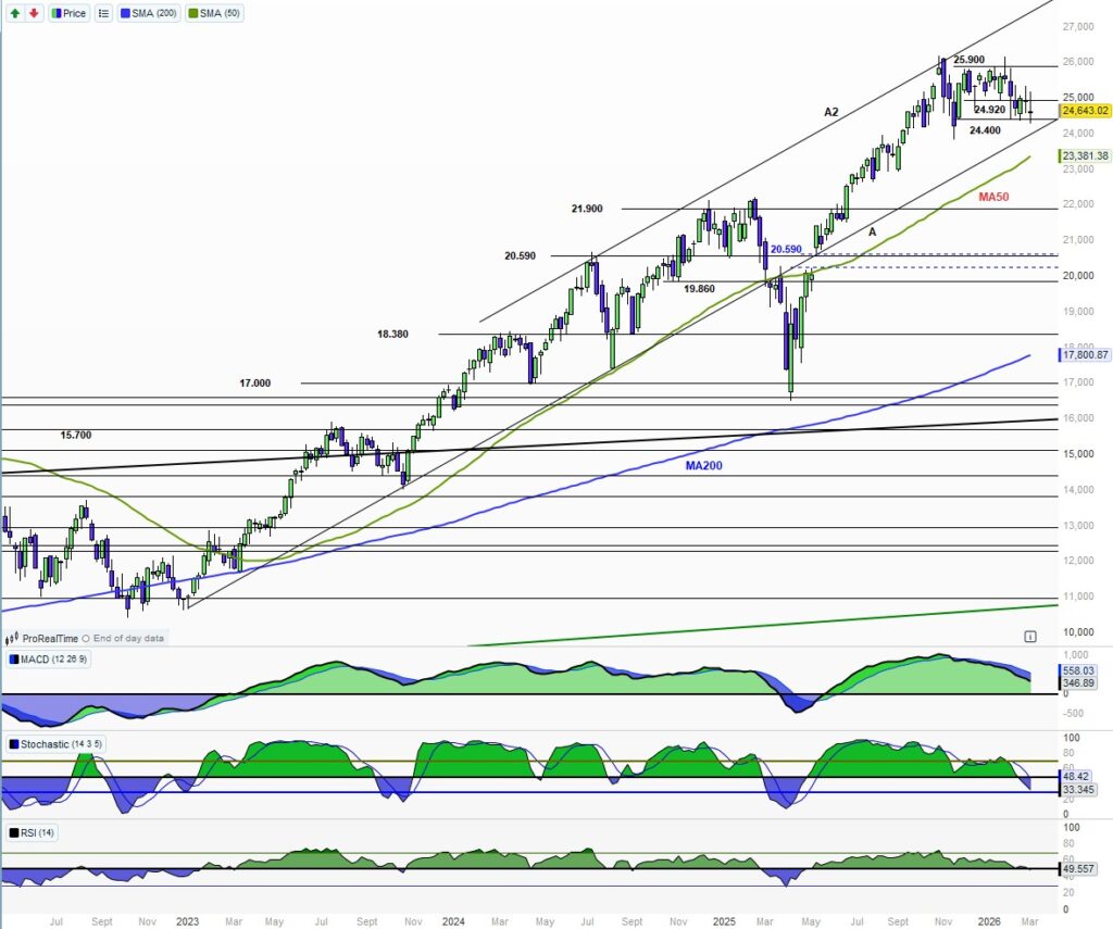 Bij de Nasdaq viel het deze week mee, maar hier zijn de indicatoren duidelijk zwakker. Nasdaq lijkt op weg naar trendlijn A.