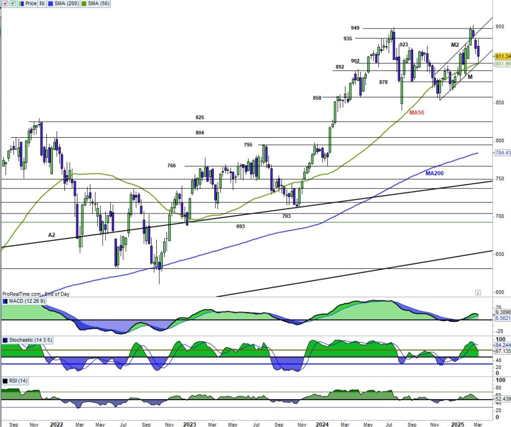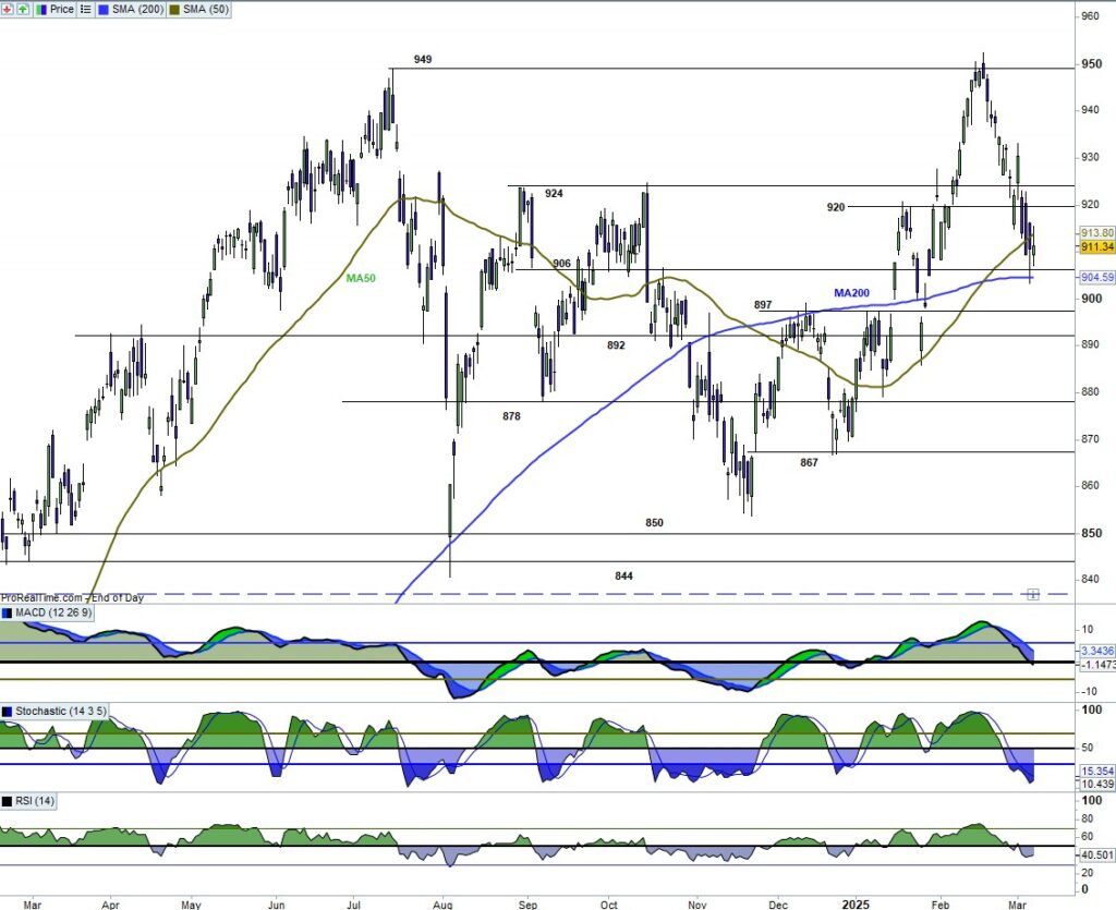 Vorige week schreef ik: “Het is dus nog de vraag of we ook nog naar de 906 zakken”. Het antwoord werd: ja. Donderdag kwamen we even onder de 906 maar de MA200 fungeerde daar als steun. Er gingen deze week tien punten af. Geen drama, zoals verwacht een beperkte correctie binnen een sterke grafiek. Maar, er is een maar. Door de daling van deze week zijn de indicatoren op dagbasis flink verslechterd. Goede kans dat we nu toch richting de volgende halte op 897 gaan.