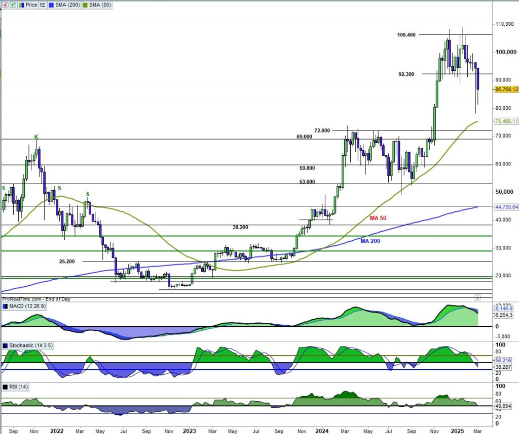 Bitcoin zakt overtuigend door steun 92.300 en de zijwaartse beweging tussen 106.400 en 92.300 is aan de onderkant verlaten. We zien dat de candle wel opveerde: Trump kondigde aan dat de VS gaat investeren in een Bitcoinreserve. Maar los daarvan was er deze week veel uitstroom uit de ETF’s.