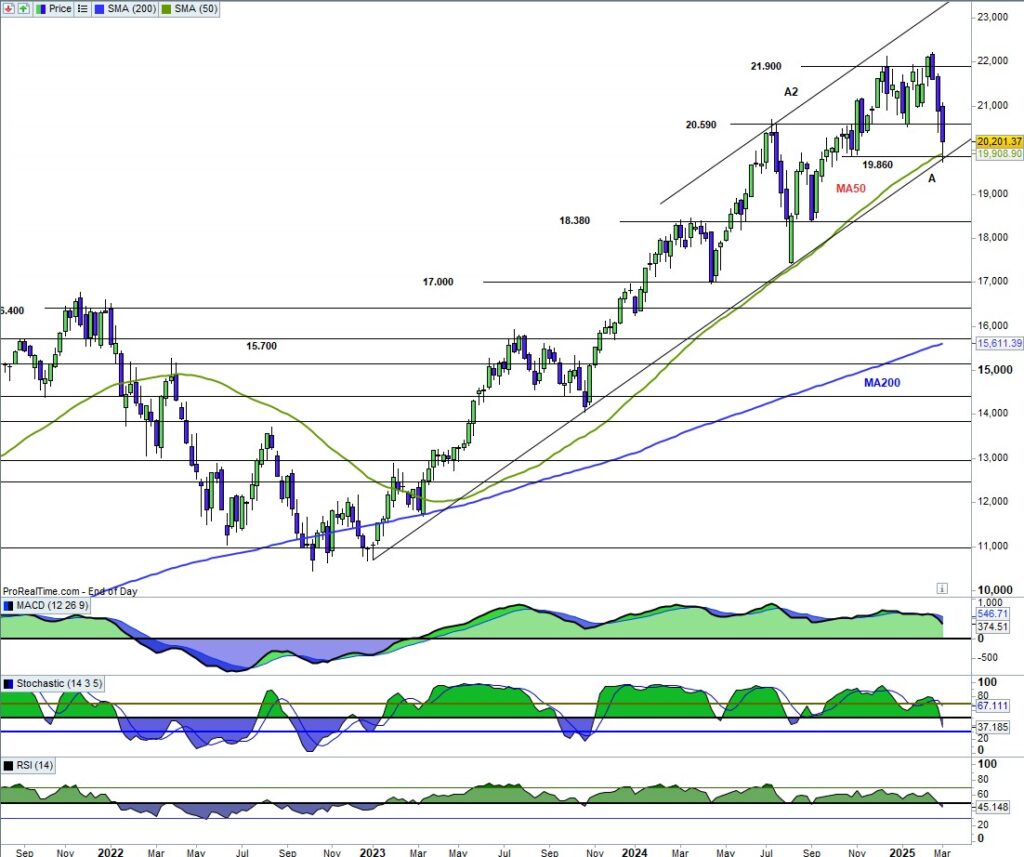 Trends zijn trends, totdat het tegendeel blijkt. Op dit moment moet ik dus ervan uitgaan dat trendlijn A het gaat houden. De candle van deze week geeft dat ook aan: weg bij A4. Maar zoals altijd is het wel spannend aan de onderkant van de trend. De indicatoren staan op dalen en we zien het snijpunt van 19.860 en lijn A. De verwachting is in elk geval: lager.