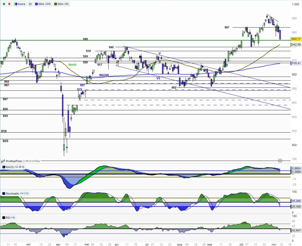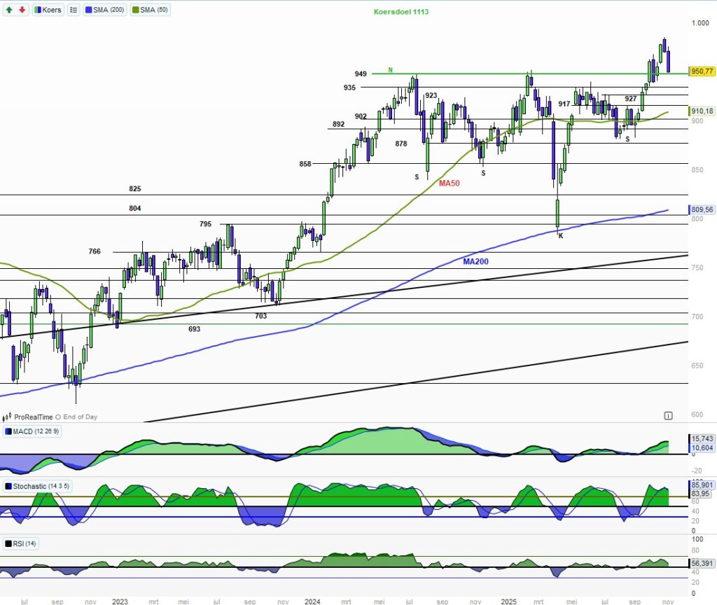 In de daggrafiek is de druk op neklijn 949 best groot. Maar in de weekgrafiek lijkt het toch vooral een reguliere pullback naar die neklijn bij positieve indicatoren.