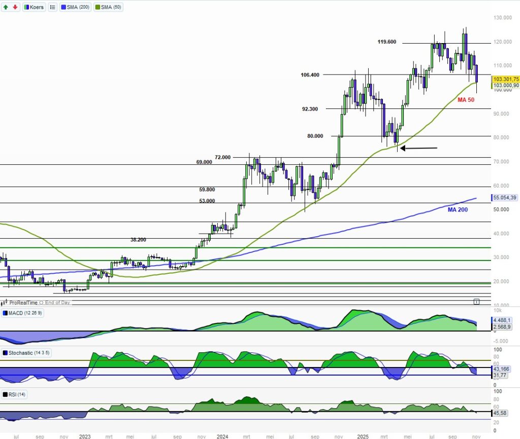 Bitcoin zakte bij slechte indicatoren door de steun op 106.400. De nieuwe steun bleek de MA50 te zijn. De vorige keer – zie de pijl – werkte die steun.