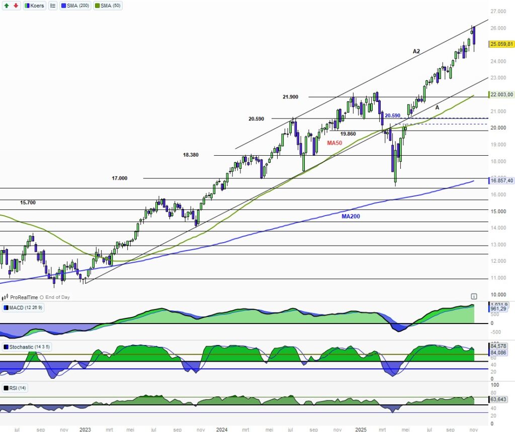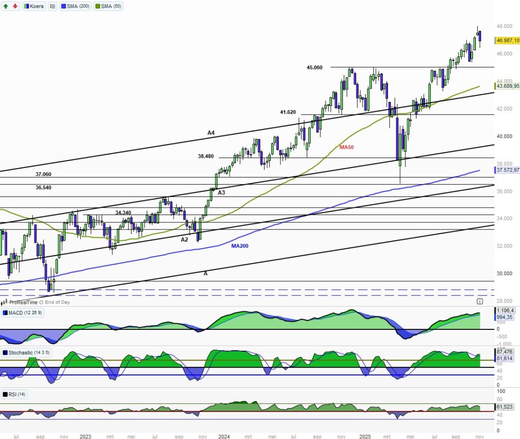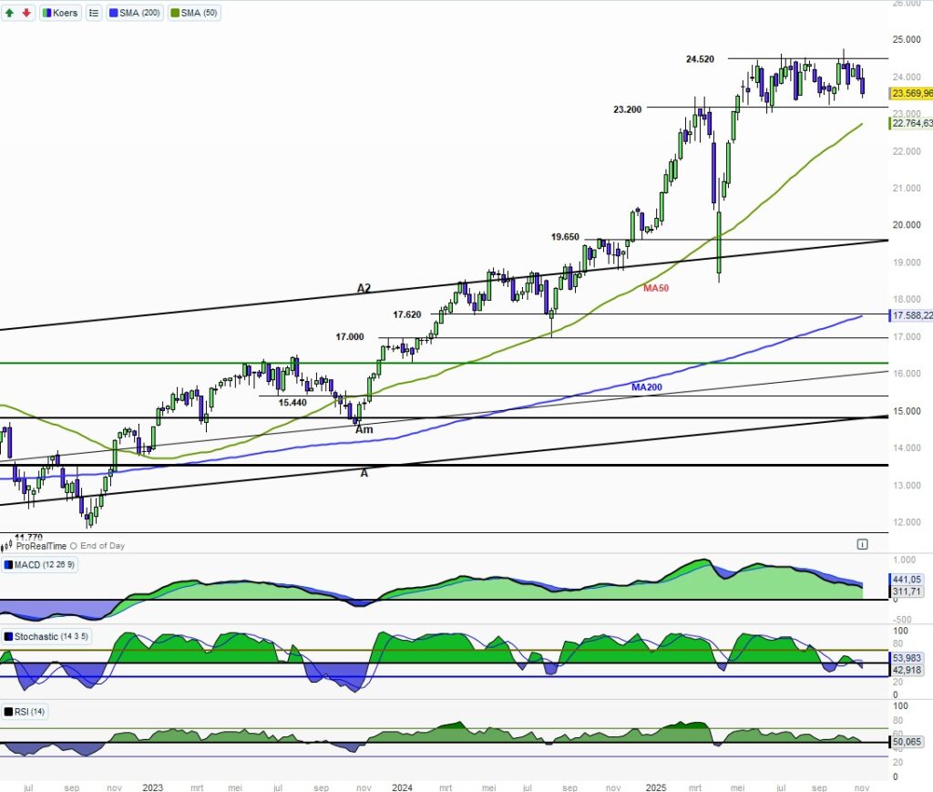 Het werd geen positief vervolg maar liefst 21 punten eraf. Men maakt zich zorgen over een eventuele AI-bubble en het consumentenvertrouwen in de VS is erg laag – ook door de government shutdown.